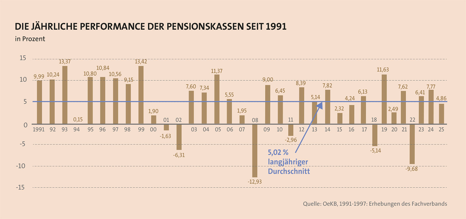 Performanceseitig schafften die überbetrieblichen Pensionskassen 2025 mit einem Wertzuwachs von 4,33 Prozent nicht den Sprung über die Fünf-Prozent-Marke. Das gelang nur zusammen mit den betrieblichen Pensionskassen auf lange Sicht, die allerdings bei der Altersvorsorge maßgeblich sind (siehe Grafik). Gleichwohl erreichten die betrieblichen Einrichtungen allein betrachtet im vergangenen Jahr mit 10,59 Prozent ein außergewöhnlich hohes Ergebnis. „Im vergangenen Jahr haben wir in der Pensionskasse eine Performance von 5,66 Prozent erzielt“, berichtet Georg Daurer, Vorstandsmitglied der BONUS Pensionskasse im Interview und freut sich über die „deutliche Outperformance von über einem Prozentpunkt“ (siehe Beitrag auf Seite 60). Trotz möglicher Differenzen bei der Berechnung offenbart der Überblick der verschiedenen Veranlagungstypen doch zweierlei: Selbst auf Fünf-Jahres-Sicht sind die Performanceunterschiede teils erheblich. Über fast alle Veranlagungen ließ die BONUS Pensionskasse Mitbewerber und Branche hinter sich. Gründe genug, bei überbetrieblichen Pensionskassen einmal nachzufragen.