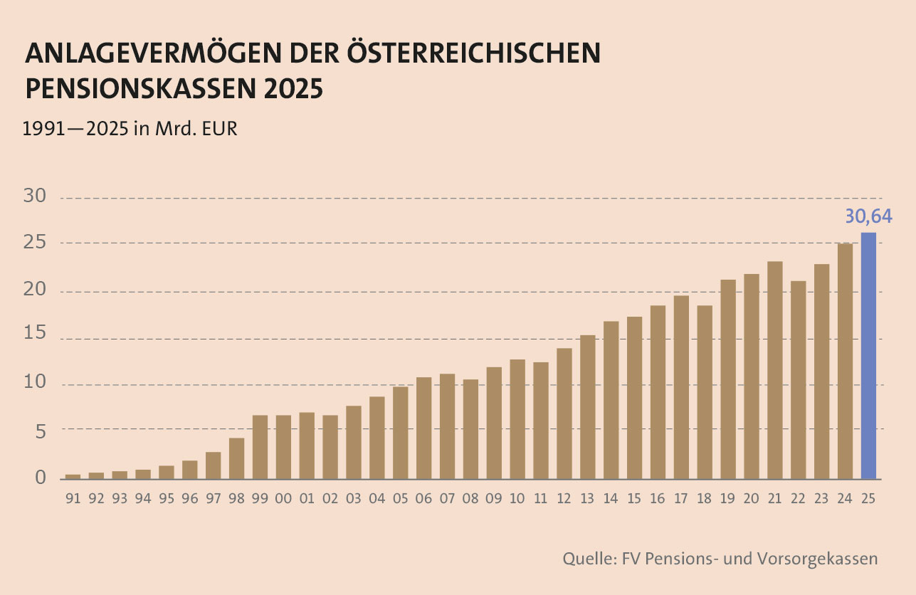 Nach Angaben des Fachverbandes haben 975.144 Österreicher Ansprüche auf eine Firmenpension erworben. Genau 159.320 Leistungsberechtigte beziehen derzeit eine monatliche Zusatzpension von durchschnittlich 419 Euro, und zwar 14-mal pro Jahr. Das verwaltete Vermögen der heimischen Pensionskassen kletterte weiter nach oben auf einen Top-Wert von gut 30 Milliarden Euro (siehe Grafik). Zudem überzeugen die Einrichtungen laut eines aktuellen Reports der Europäischen Aufsichtsbehörde für das Versicherungswesen und die betriebliche Altersvorsorge (EIOPA) mit einer sehr guten Kosten-Struktur, informiert der Verband. Demnach weisen die heimischen Adressen der repräsentativen Erhebung zufolge die geringsten Kosten auf – ein positiver Faktor für hiesige Kunden.